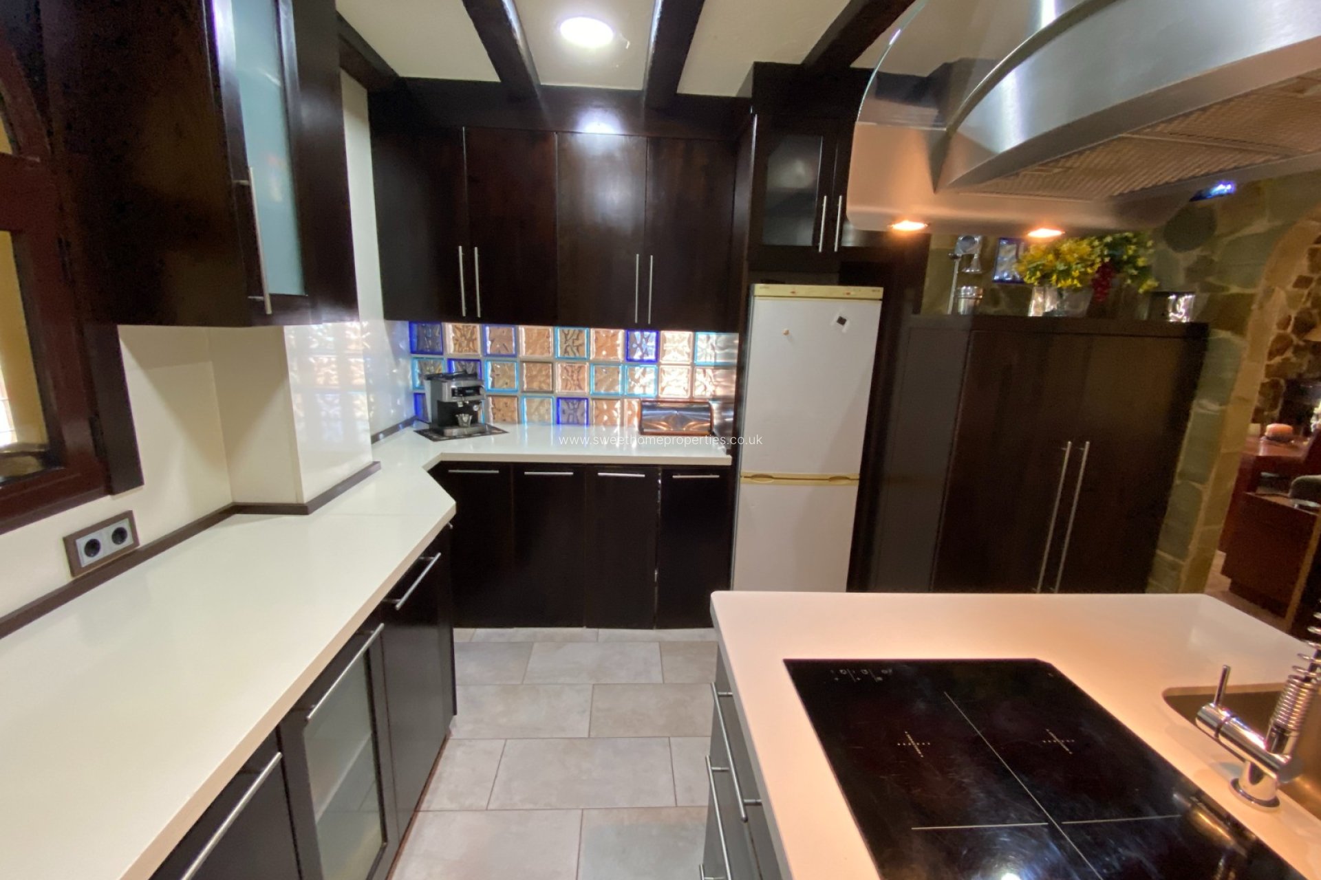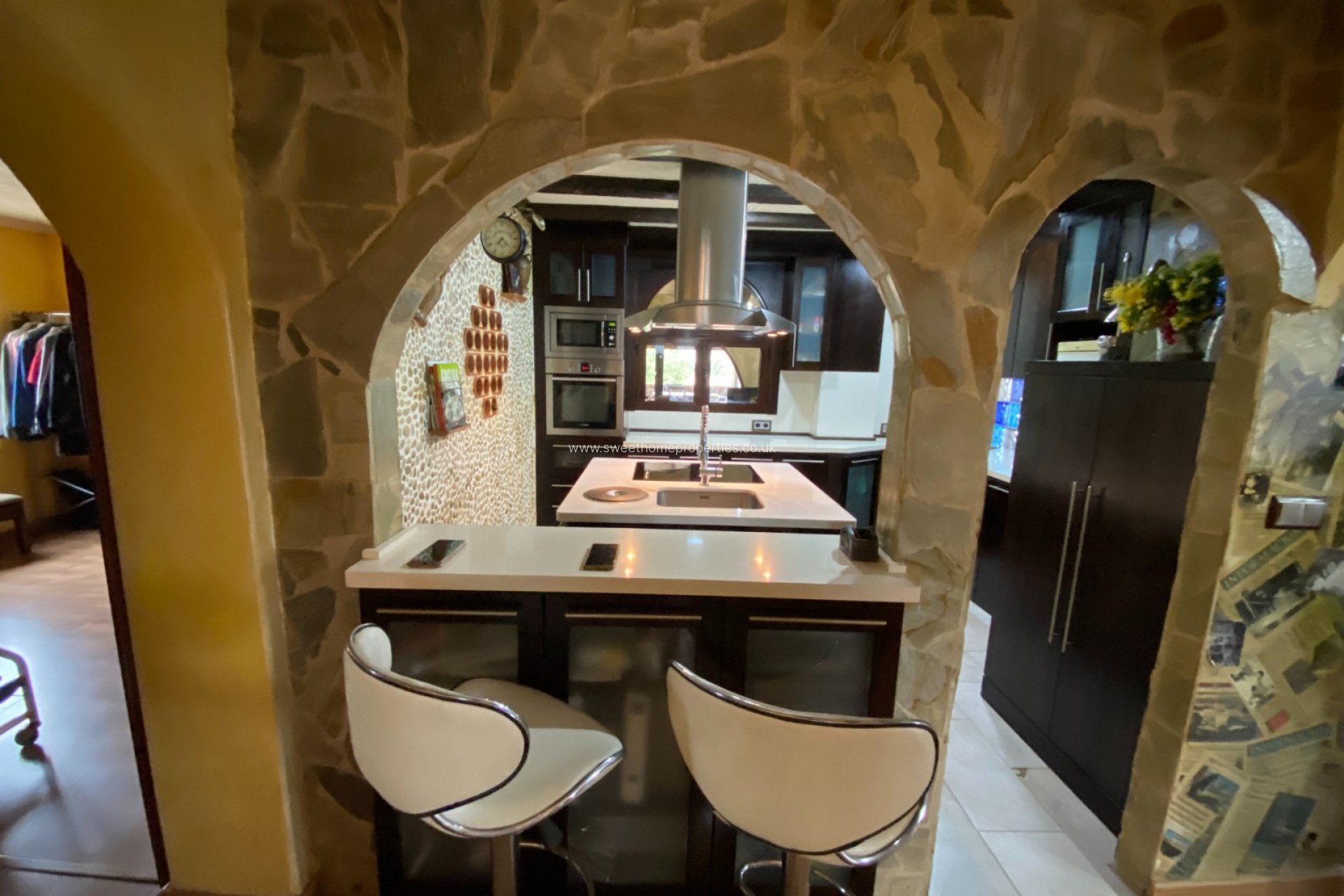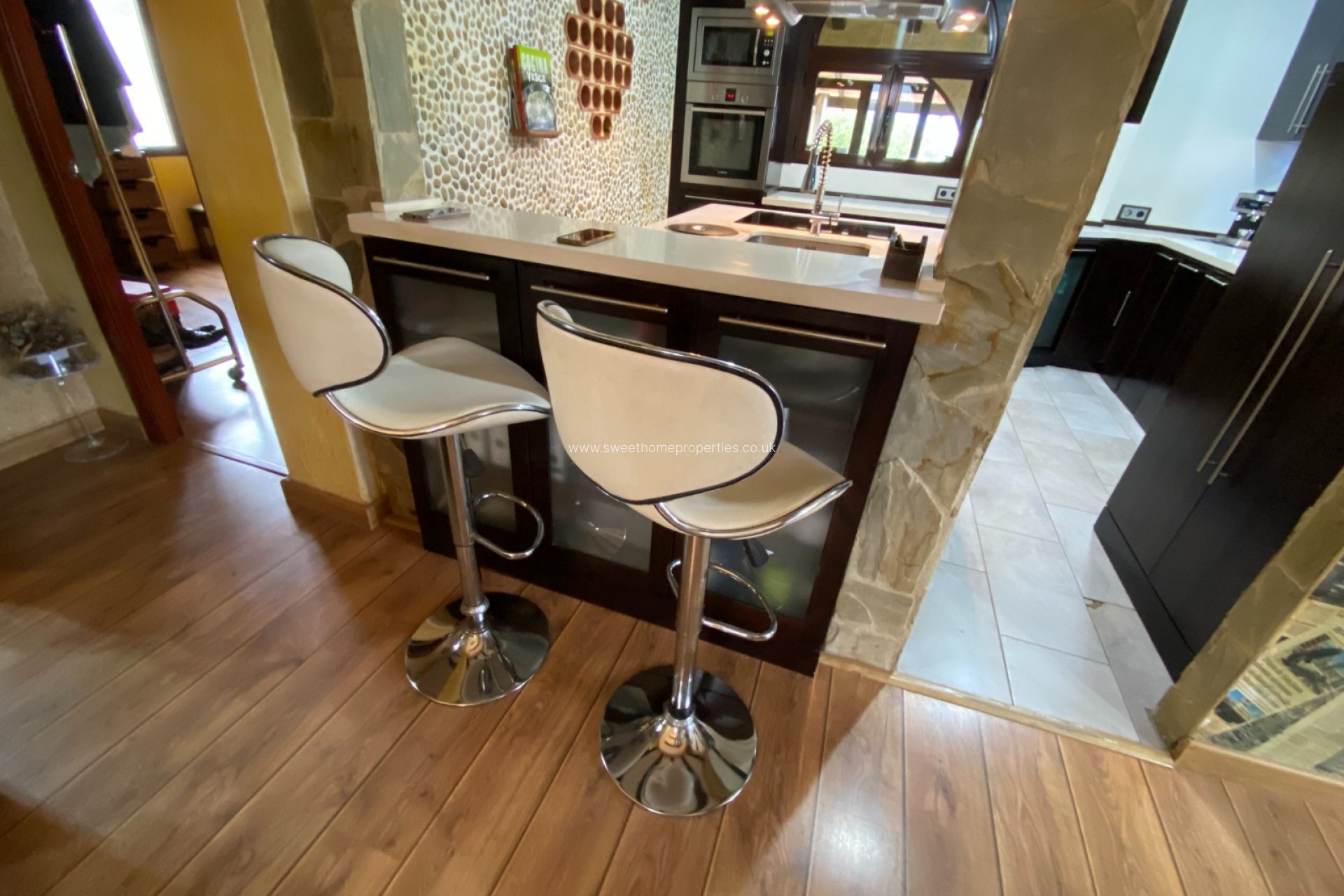 Inside, the home features a welcoming entrance hall leading to two separate living areas. One serves as a dining room with direct access to the outdoor entertaining space, while the second lounge connects to a stylish, recently installed modern kitchen. A short hallway separates the living and sleeping areas, where you’ll find two bedrooms and a contemporary bathroom. The master bedroom benefits from a spacious dressing room.