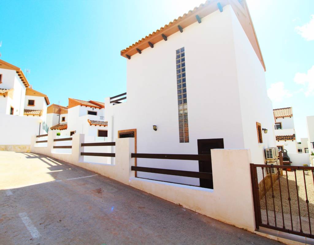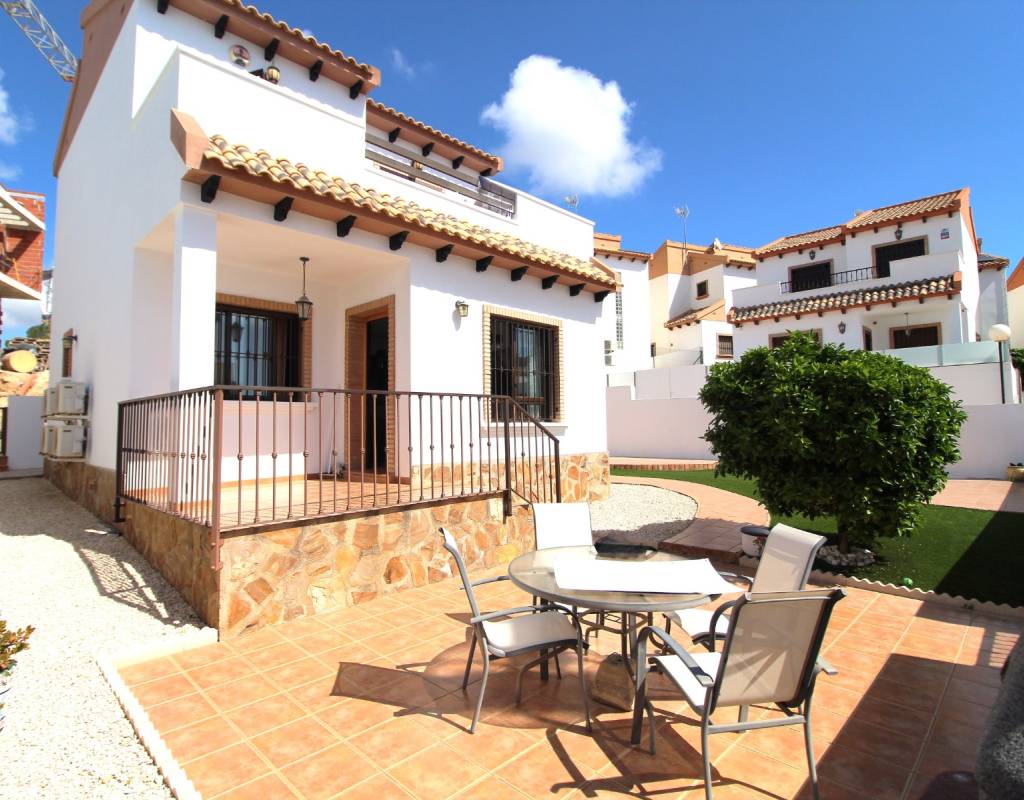 A great opportunity to buy a very well presented 3 bedroom 2 bathroom (115m2) detached villa in the well established Villamartin area. This house which is sold fully furnished including white goods is finished to a high quality throughout including air conditioning, satellite tv, fitted wardrobes, alarm, store room and a landscaped garden. Owner of the properties in this development have access to a communal swimming pool. Many amenities such as supermarket, bars and restaurants are within a 10-15min walk. Furthermore it is less than 10mins drive to four 18 hole golf resorts (Villamartin, La Ramblas, Campoamor and Las Colinas golf).
